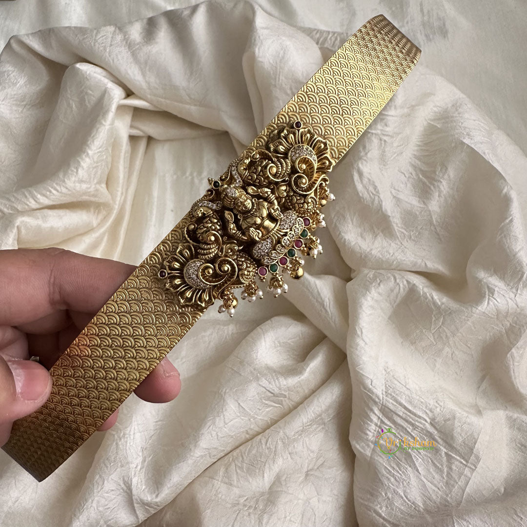 AD Stone Lakshmi Pendant Plain Hipbelt-Gold Bead Pearl– Gold Look alike Hipbelt with green and red imitation stone and embossed plain hipbelt.