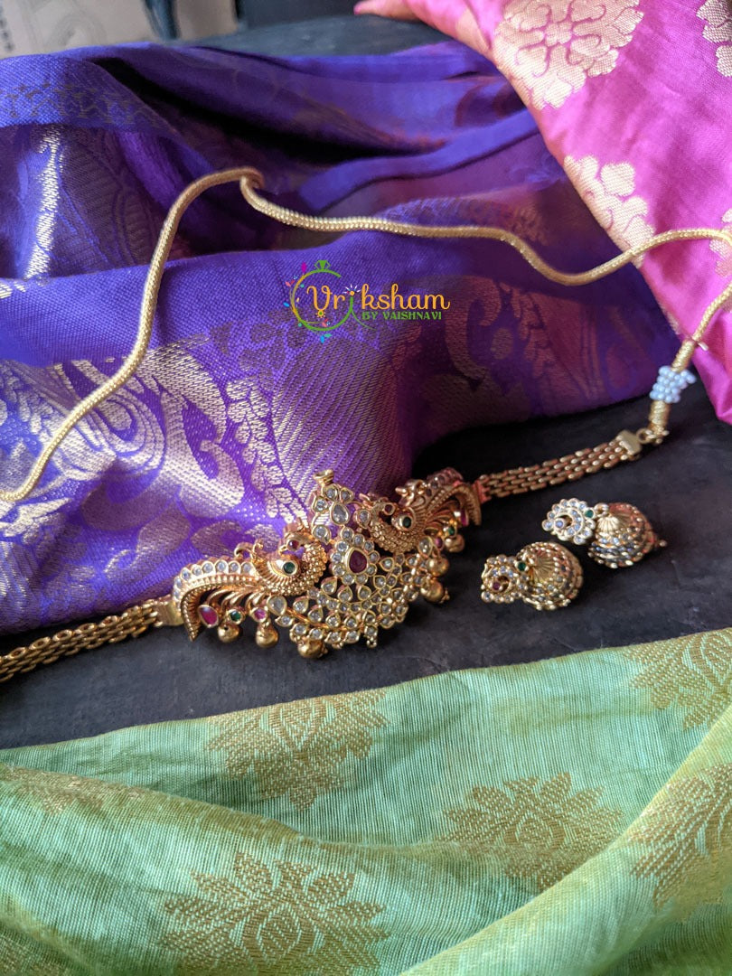 AD Stone Peacock High Neck Choker -Premium quality high neck choker with peacocks and AD stone studded; golden bead finish, comes with matching jhumkas.