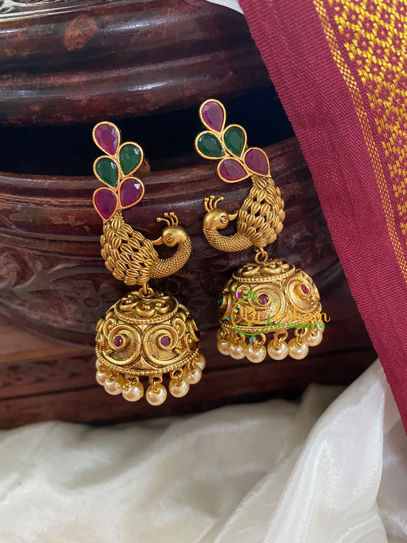 AD Stone Peacock Jhumkas -Red green regular stone studded peacock stud with golden ball finish.