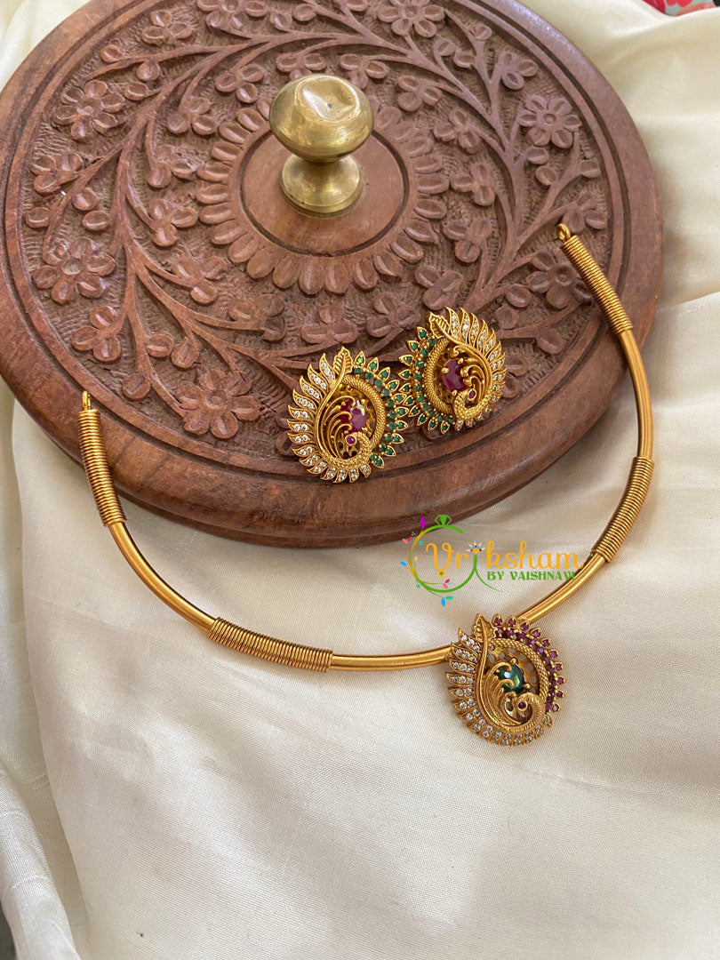 AD Stone Peacock Pendant Hasli-plain ;premium quality AD Stone studded pendant hasli short neckpiece, comes with matching earrings.