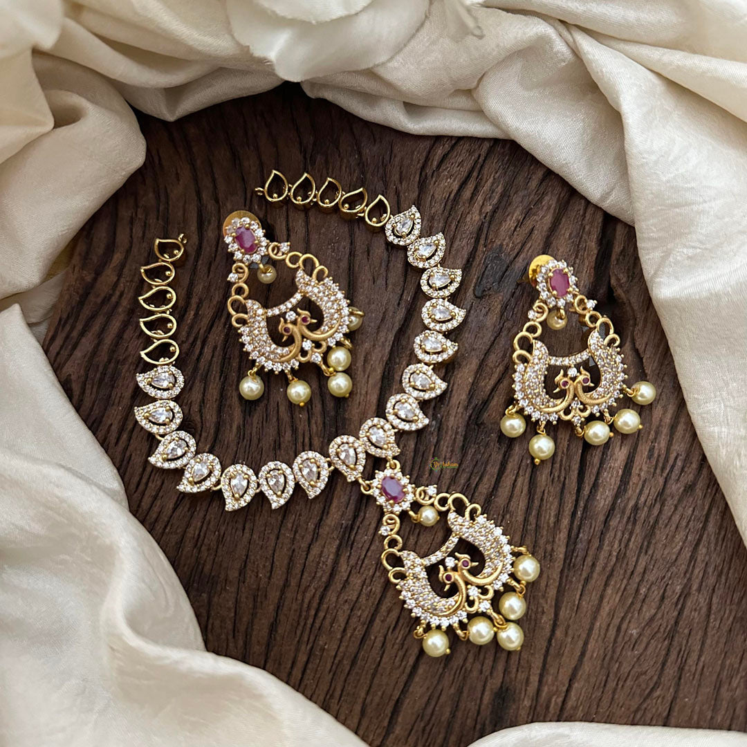 Elevate your style with this AD Stone Peacock Pendant Short Neckpiece in striking red and pearl, complete with matching earrings. Experience the beauty and grace of the peacock with this elegant and eye-catching statement piece. Perfect for any occasion, this necklace will add a touch of sophistication to any outfit.