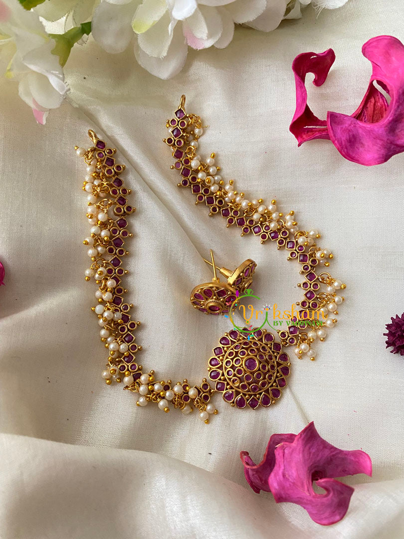 AD Stone Pearl High Neck Choker red AD stone studded center pendant and cluster pearl finish choker with Earrings