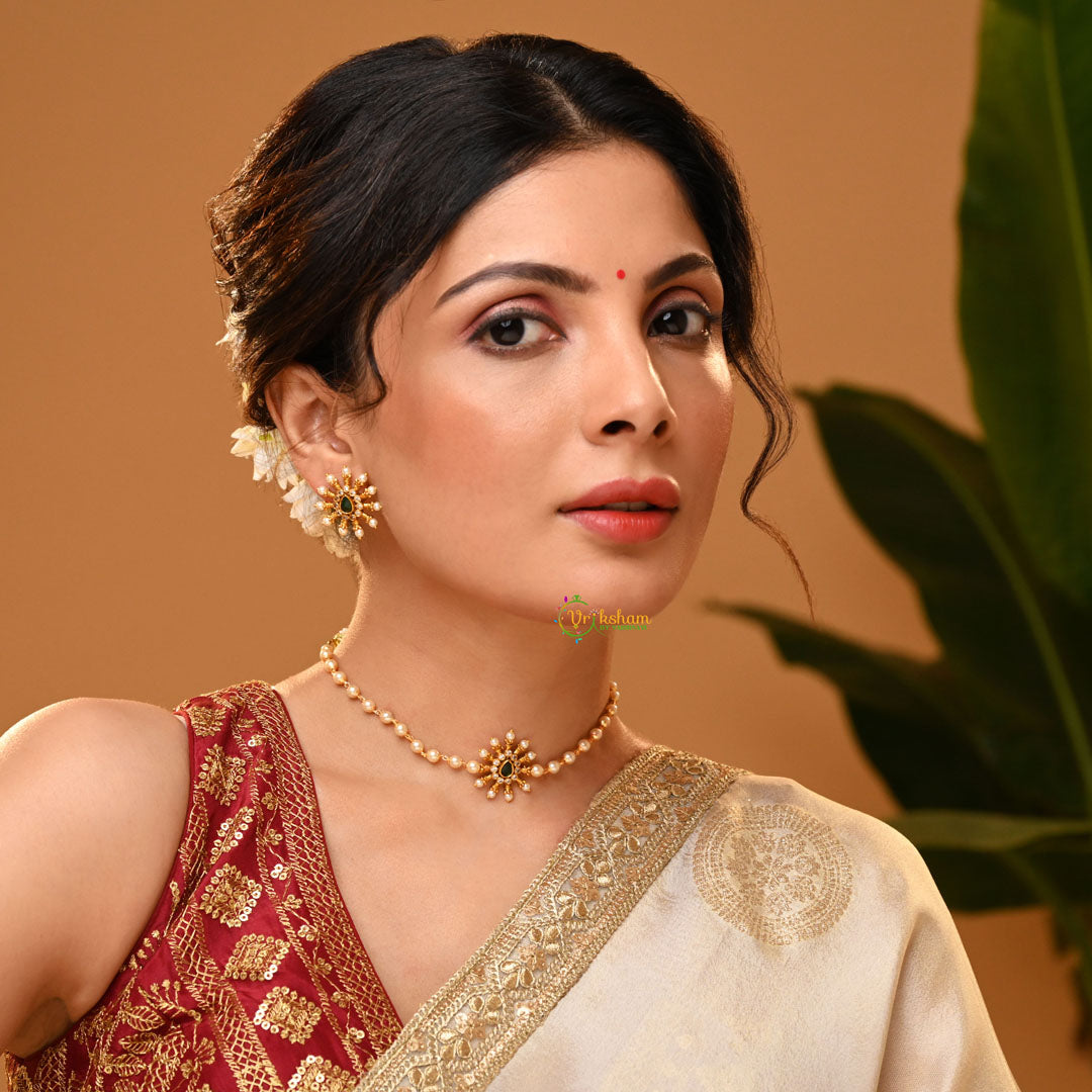 AD Stone Pearl High Neck Choker -Premium quality high neck choker chakra pattern with Green stone and pearl finish, comes with matching earrings.