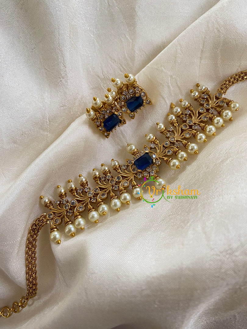 AD Stone Pearl High Neck Choker-Blue -Square centre stone choker neckpiece; comes with matching studs.