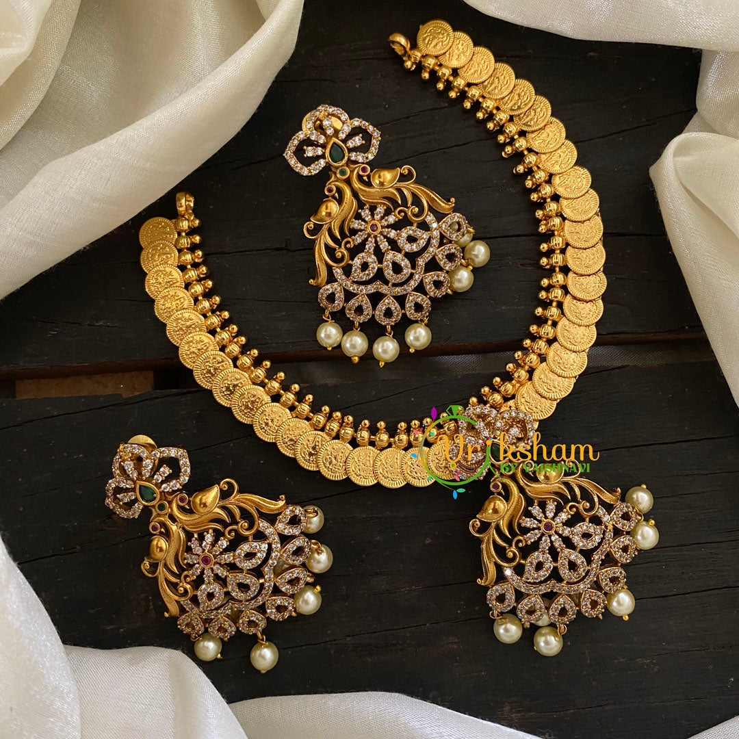 AD Stone Pendant Coin Choker Short Neckpiece -white AD stone floral pendantand coin patterned choker short neckpiece with earrings.