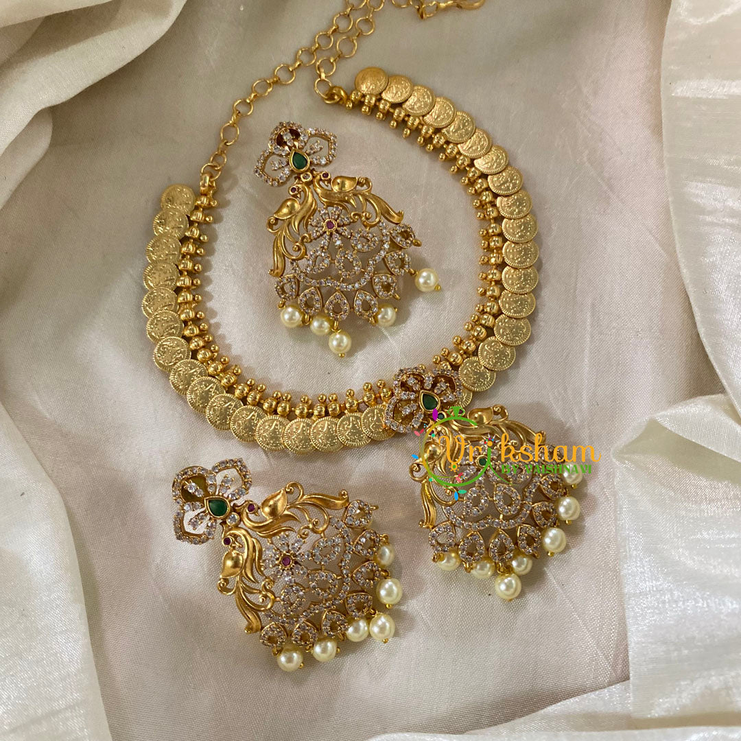 AD Stone Pendant Coin Choker Short Neckpiece -white AD stone floral pendantand coin patterned choker short neckpiece with earrings.