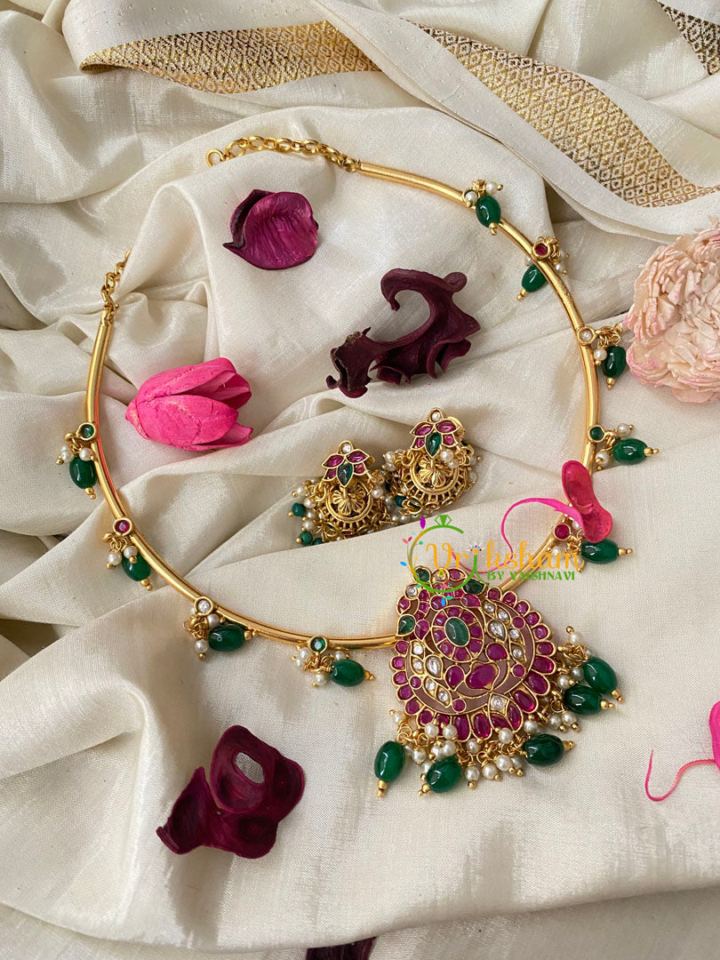 Precious Kundan Jadau Pendant Hasli Choker-Floral– Pearl and Green bead finish; Premium quality precious kundan jadau work.