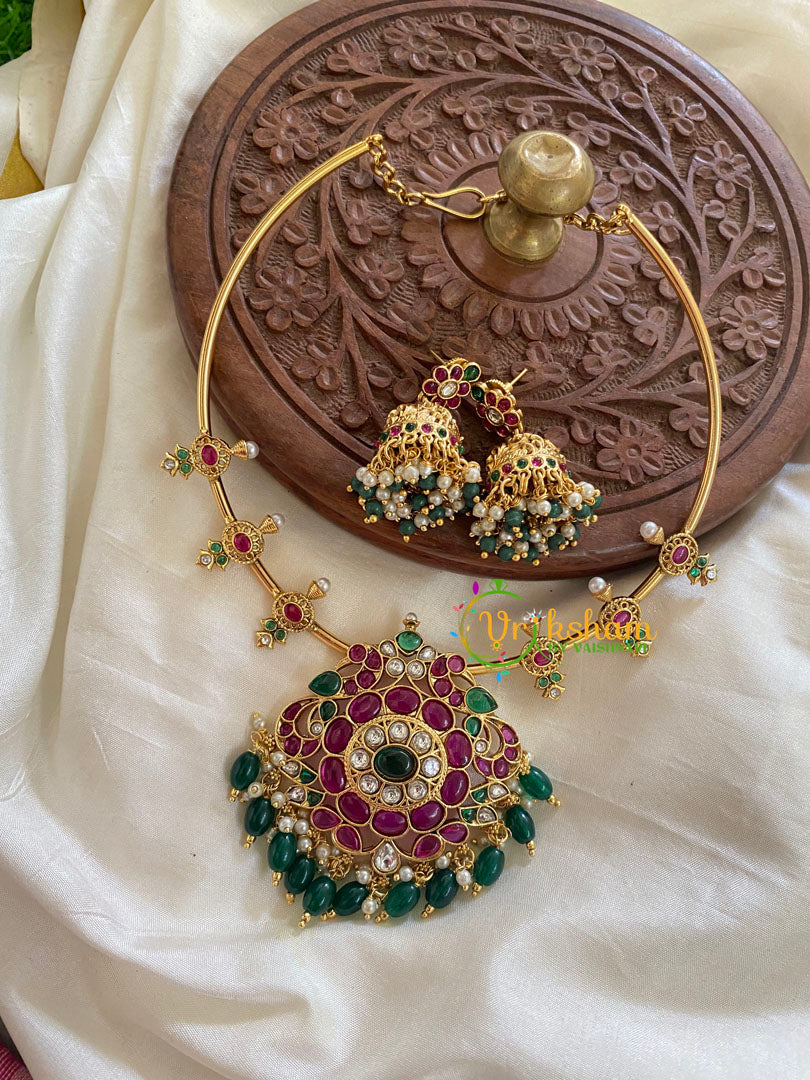 Premium AD Stone Pendant Hasli-Green- premium quality AD Stone studded pendant hasli short neckpiece, comes with matching earrings.