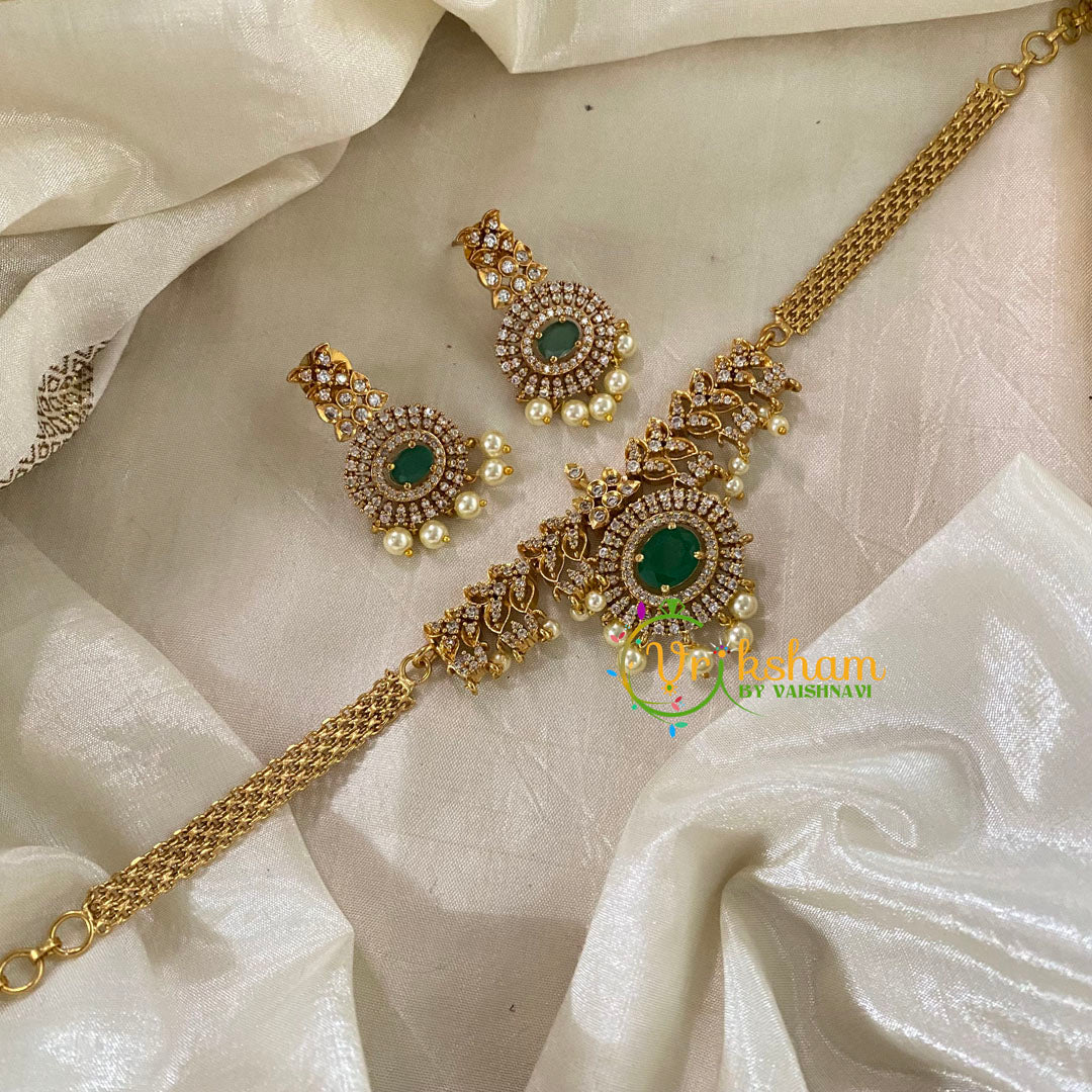 AD Stone Pendant High Neck Choker-Pearl -Green-G9036