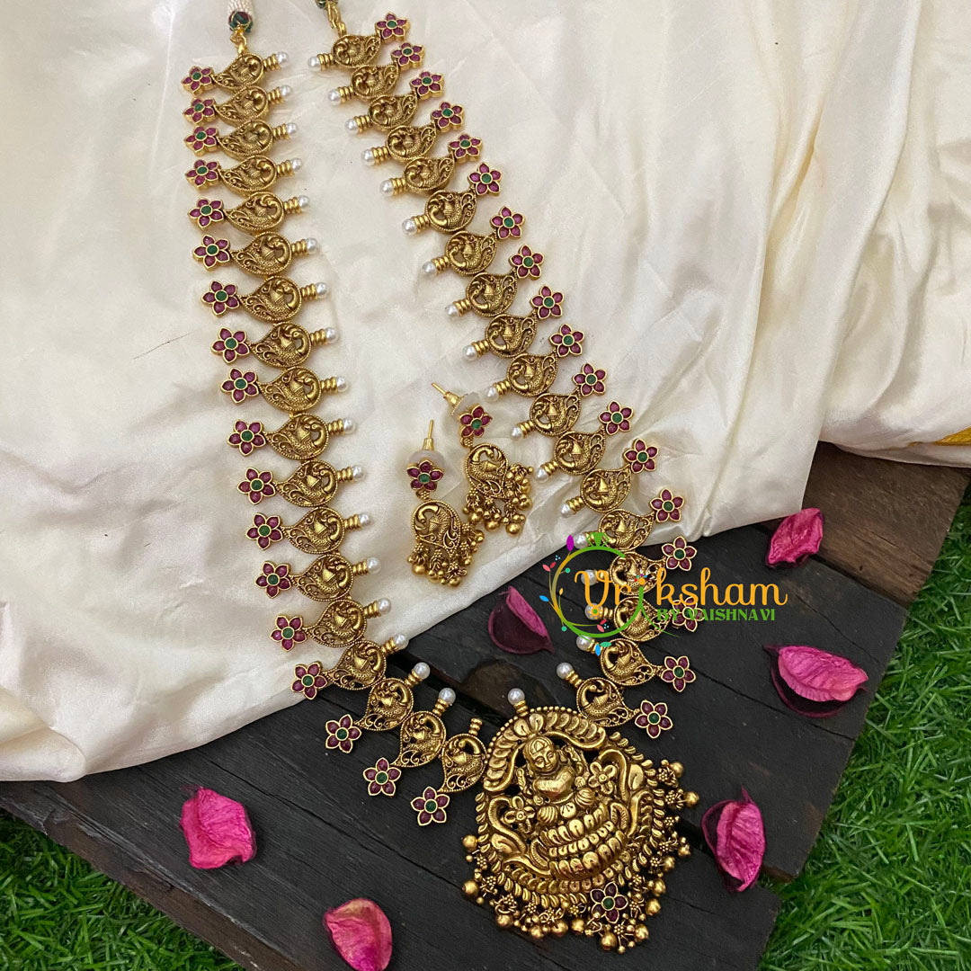 Premium AD Stone Pendant Lakshmi Haram – premium polish Gold pearl bead finish temple jewelry with peacock pendant and lakshmi peacock paisley patterned neckpiece, comes with matching jhumkas.
