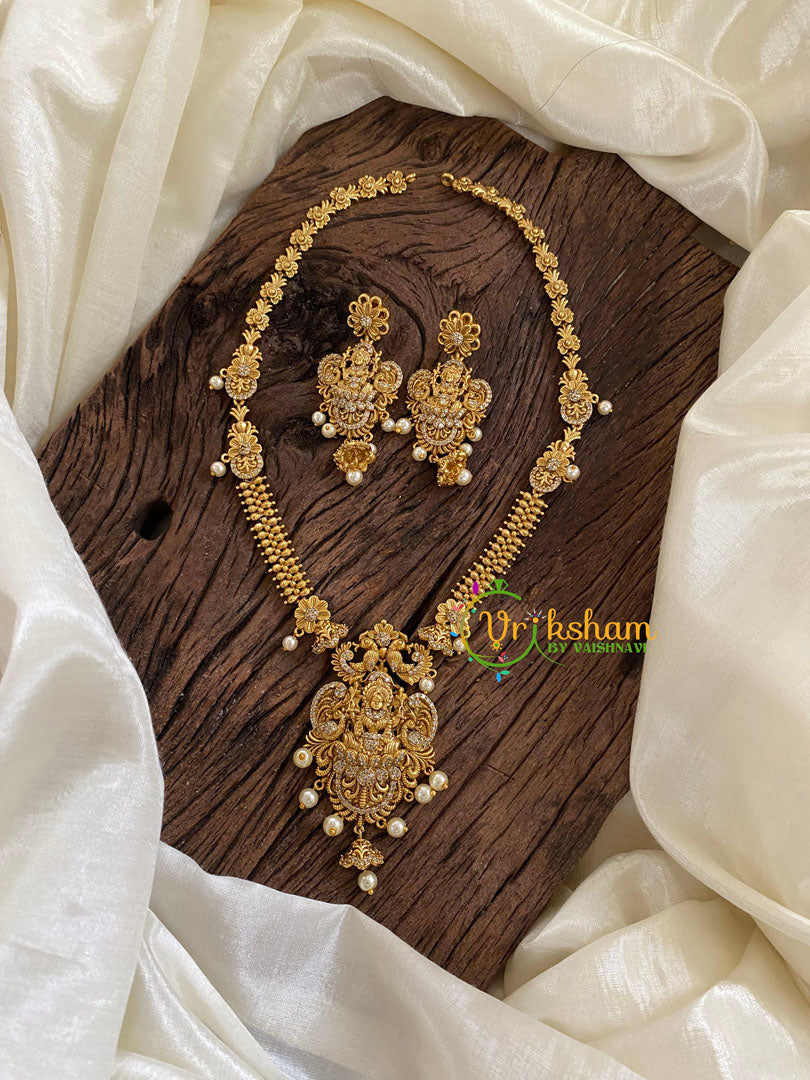 Premium AD Stone Pendant Lakshmi Haram – premium polish pearl finish temple jewelry with lakshmi peacock patterned neckpiece, comes with matching jhumkas.