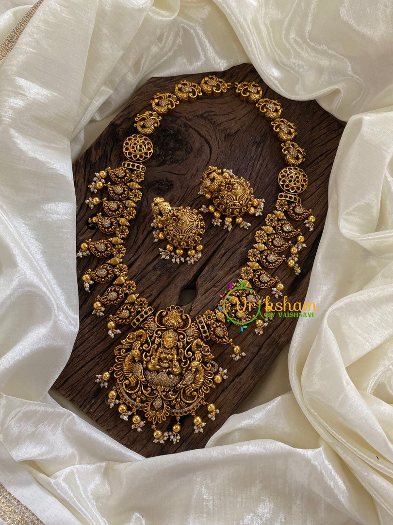 Premium AD Stone Pendant Lakshmi Haram – premium polish pearl finish temple jewelry with lakshmi paisley patterned neckpiece, comes with matching jhumkas.