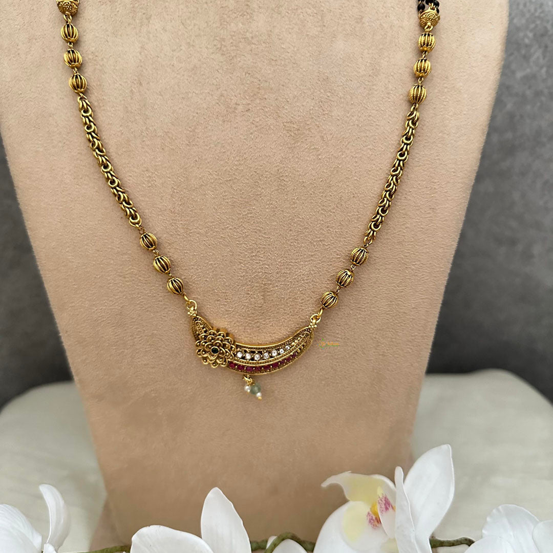 Indulge in the luxurious charm of our AD Stone Pendant Mangalsutra Chain. With exquisite AD stones, lustrous pearl, and a striking green bead, this necklace exudes elegance and sophistication. Elevate your style and embrace a sense of exclusivity with G13257. Comes with matching earrings.