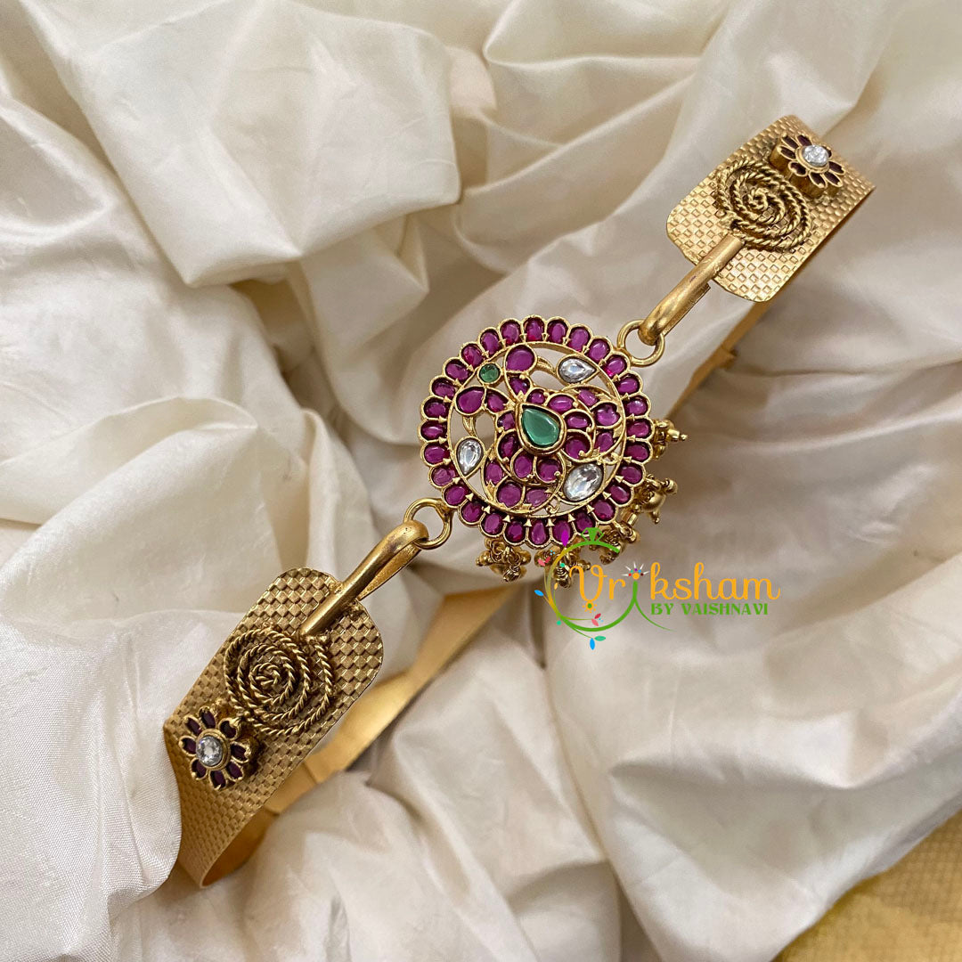 AD Stone Pendant Plain Hipbelt -Peacock pendant – Gold Look alike Hipbelt with green and red imitation stone and embossed plain hipbelt.