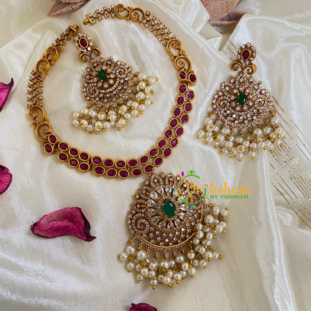 AD Stone Pendant Short Neckpiece - AD Stone studded lean neckpiece with tilak pendant, green and white ad stone pendant; comes with danglers.