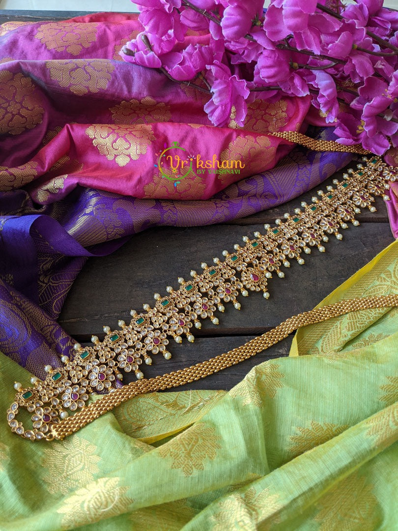 AD Stone Premium Hipbelt - Flower with geometrical pattern ; pearl studded on both upper and bottom layer with white, red and green AD stones; comes with back chain.
