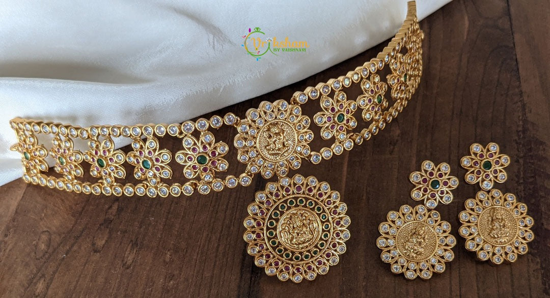 AD stone Temple High Neck Choker with Pendant – AD Stone studded lakshmi choker with ganesha and lakshmi pendanr and cluster pearl choker, comes with earrings.