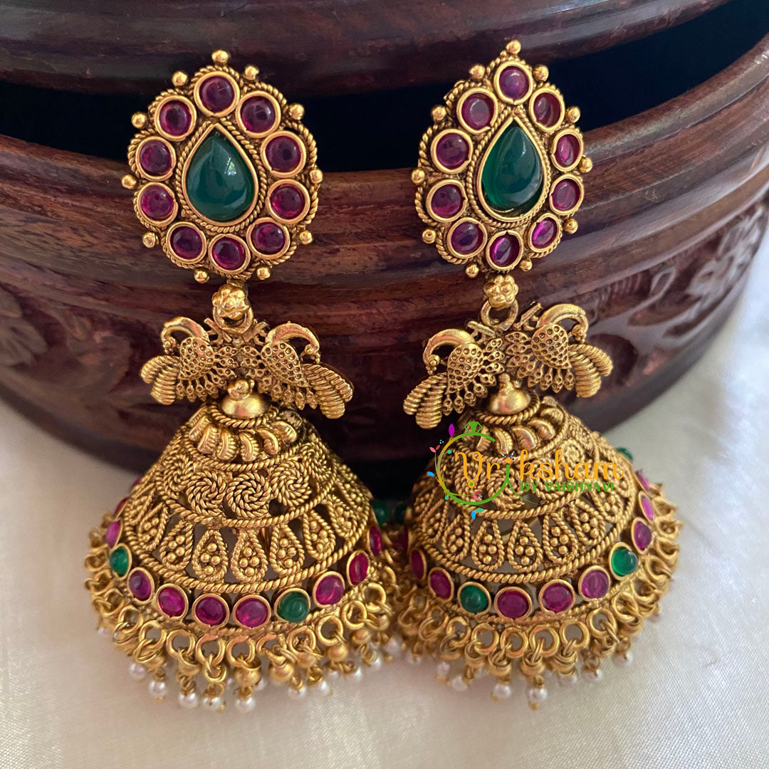 AD Stone Traditional Jhumkas -Red Green– green and red AD stone jhumka with centre small peacock. and pearl finish.