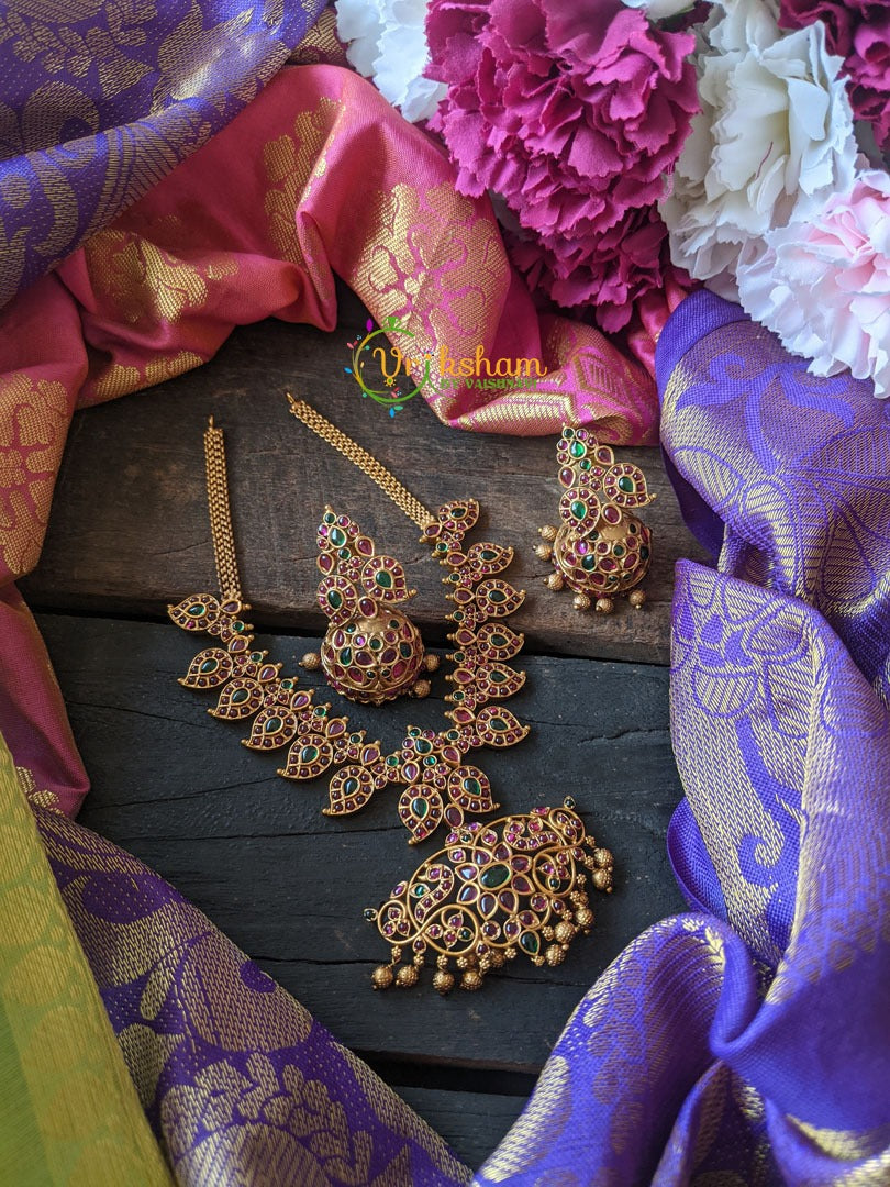 AD Stone Traditional Maanga Neckpiece with Pendant -Red Green stone set neckpiece with matching jhumkas.