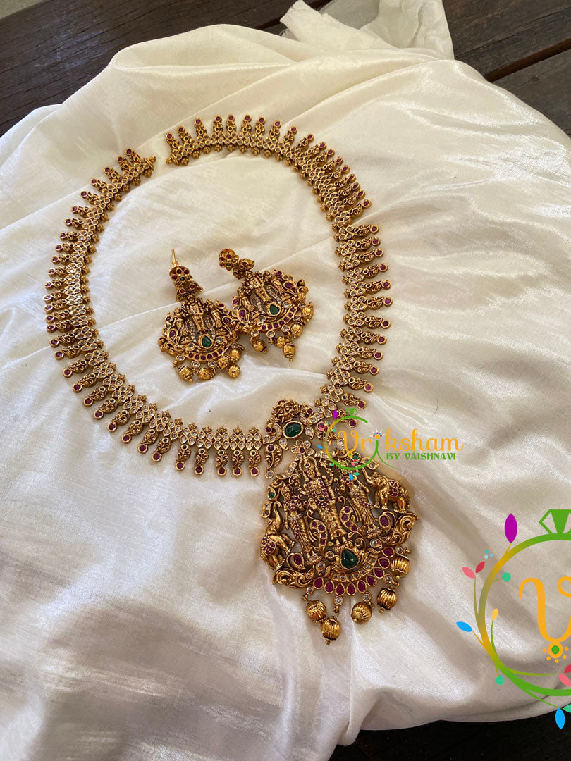 Premium AD Stone Vishnu Temple Haram - Gold Bead Finish- Premium quality long neckpiece - Red White and Green stones, comes with similar matching ear hangings.