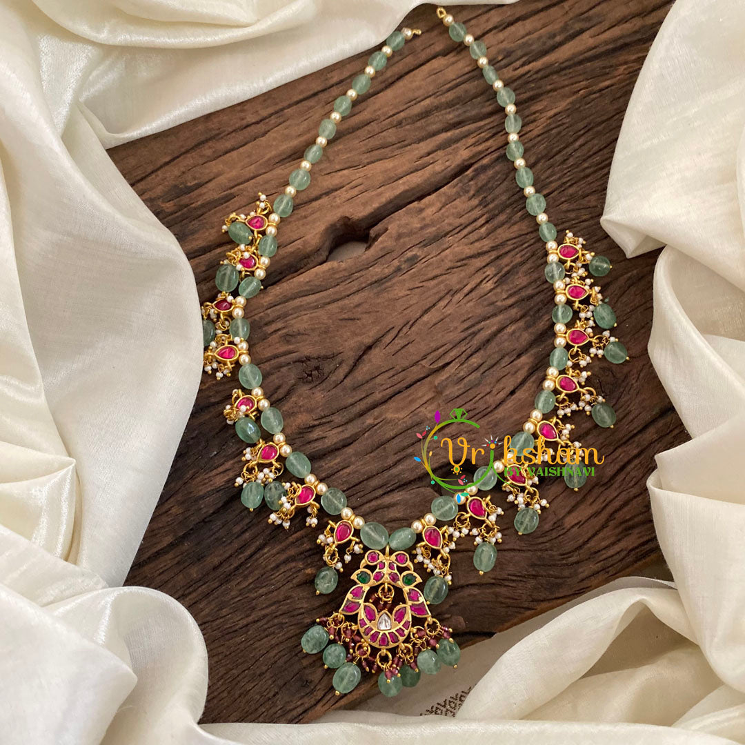 Pastel Green Bead Jadau Kundan Pendant Mala is one of our highest quality jewelry; handmade by artisans; this boasts the design and quality of a real silver.