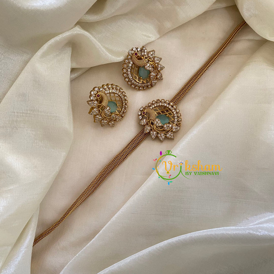 Traditional Addigai Choker Neckpiece -pastel green imitation stones studded pendant with plain neck chain with earrings.