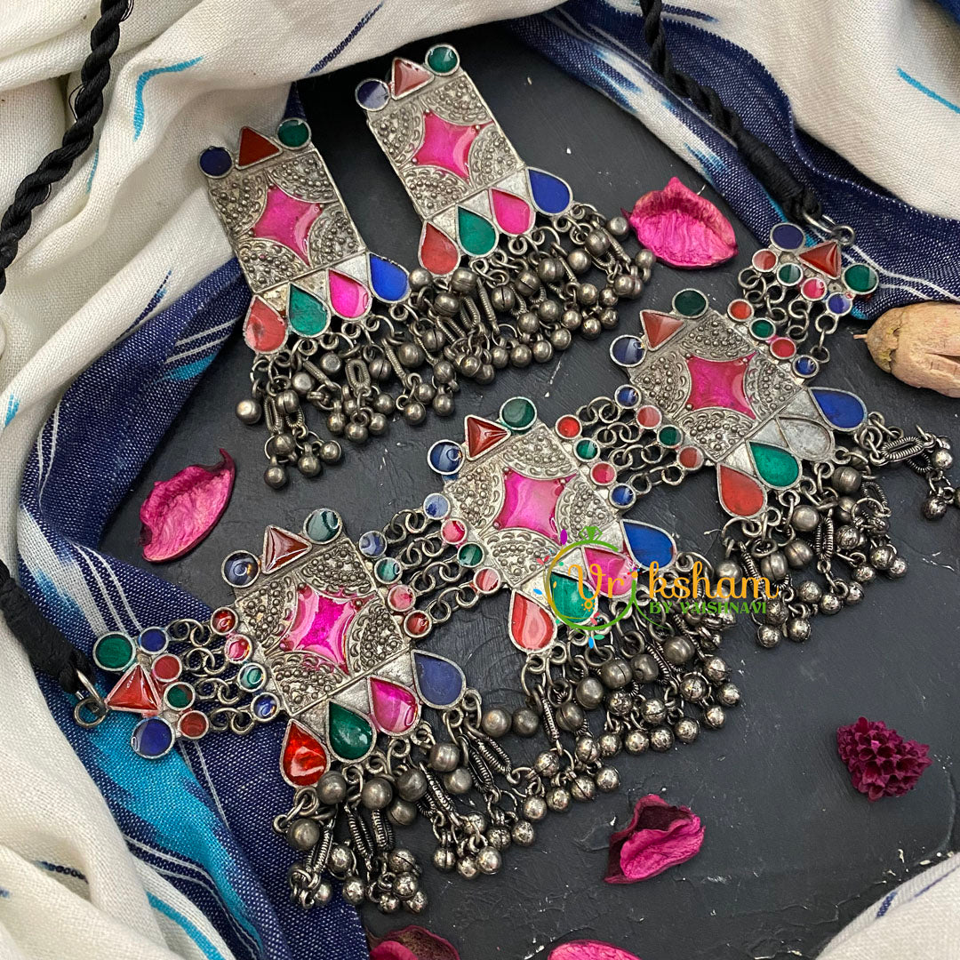 Statement Silver Neckpiece -Afghani Glass Choker- multicolor glass studded silver neckpiece; comes with matching earrings.