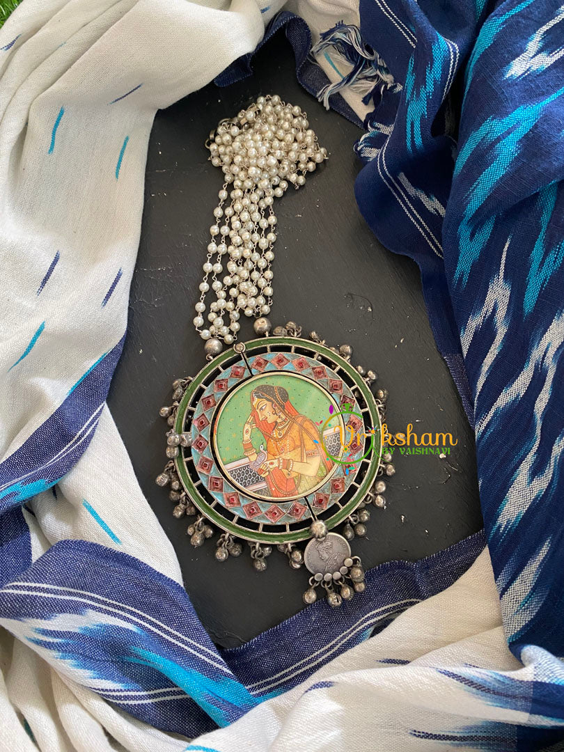 Afghani Silver Neckpiece with Meenakari Pendant–  pendant neckpiece; layered pearl long chain. ONLY NECKPIECE.