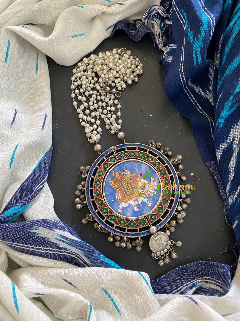Afghani Silver Neckpiece with Meenakari Pendant–  pendant neckpiece; layered pearl long chain. ONLY NECKPIECE.