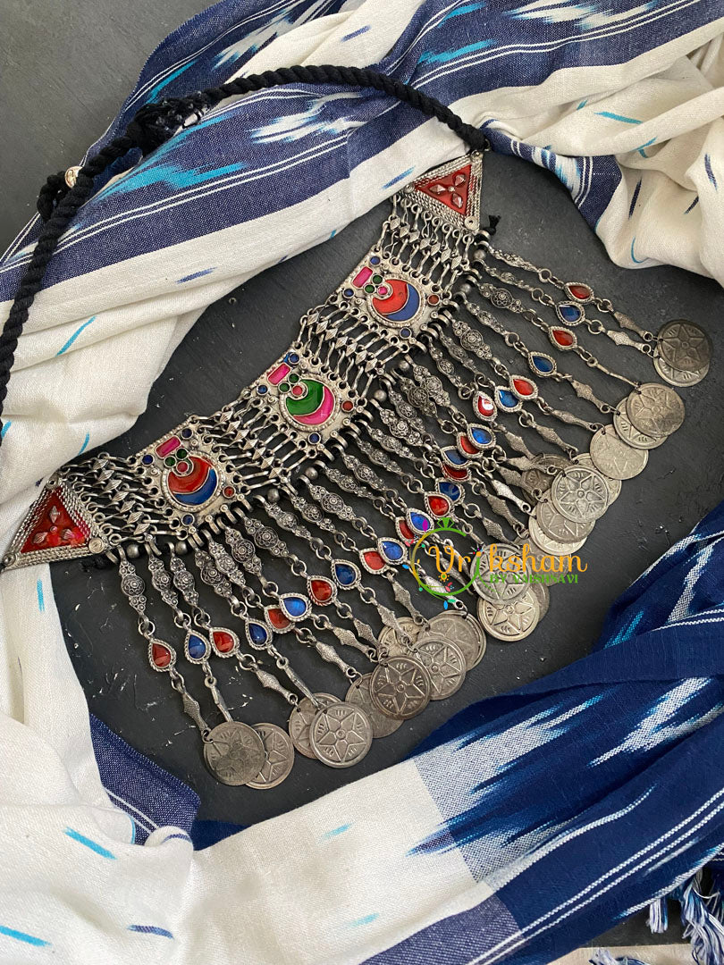 Afghani Statement High Neck Choker- Tribal pattern- Silver look alike polish, black back rope; comes with matching studs.