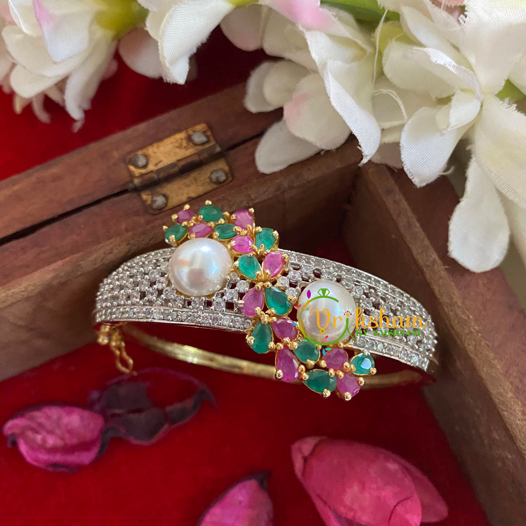 American Diamond Bracelet-pearl studded; pink green and white AD stone pattern -Gold Tone Bracelet.