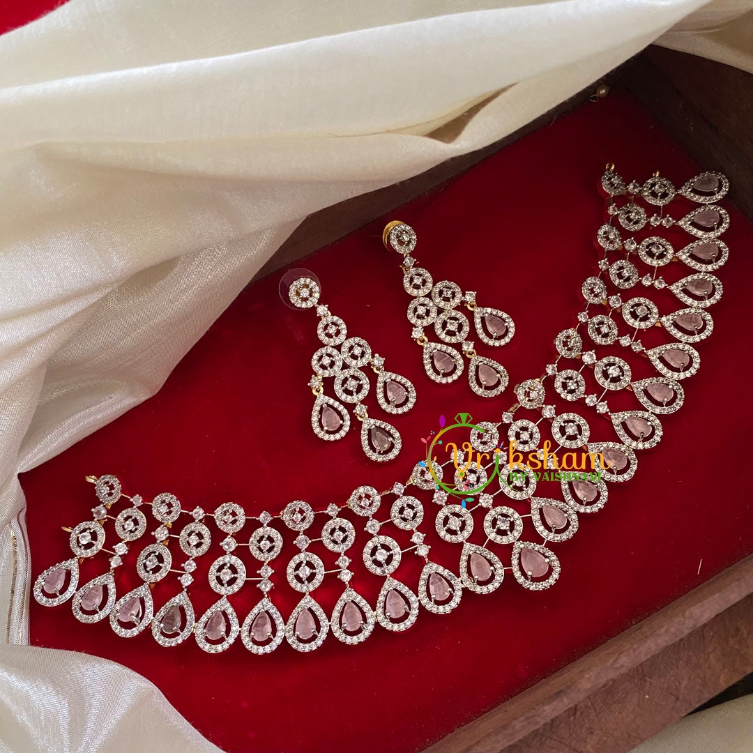 Peach Layered American Diamond Bridal Choker-Short Neckpiece–GOLD TONE imitation jewellery set; Comes with a pair of similar danglers.