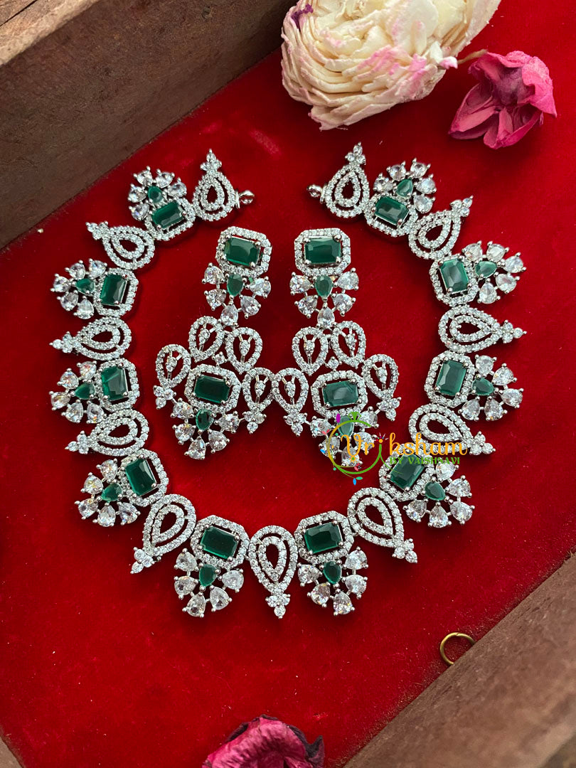 Green American Diamond Bridal Choker-Short Neckpiece–WHITE TONE imitation jewellery set; Comes with a pair of similar danglers.