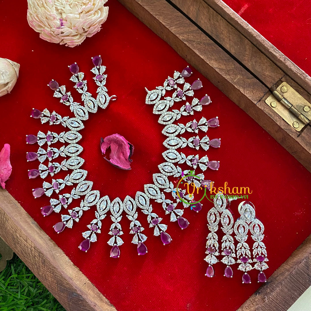 Red Pink American Diamond Bridal Choker–WHITE TONE imitation jewelry set; Comes with a pair of similar danglers.