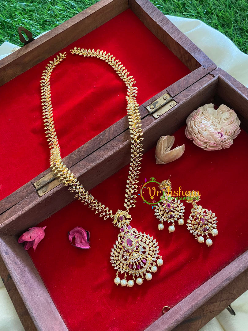 Gold American Diamond Bridal Haram-Red– gold look alike tone with centre Red stone idol work in gold imitation jewellery set; Comes with a pair of similar earrings.