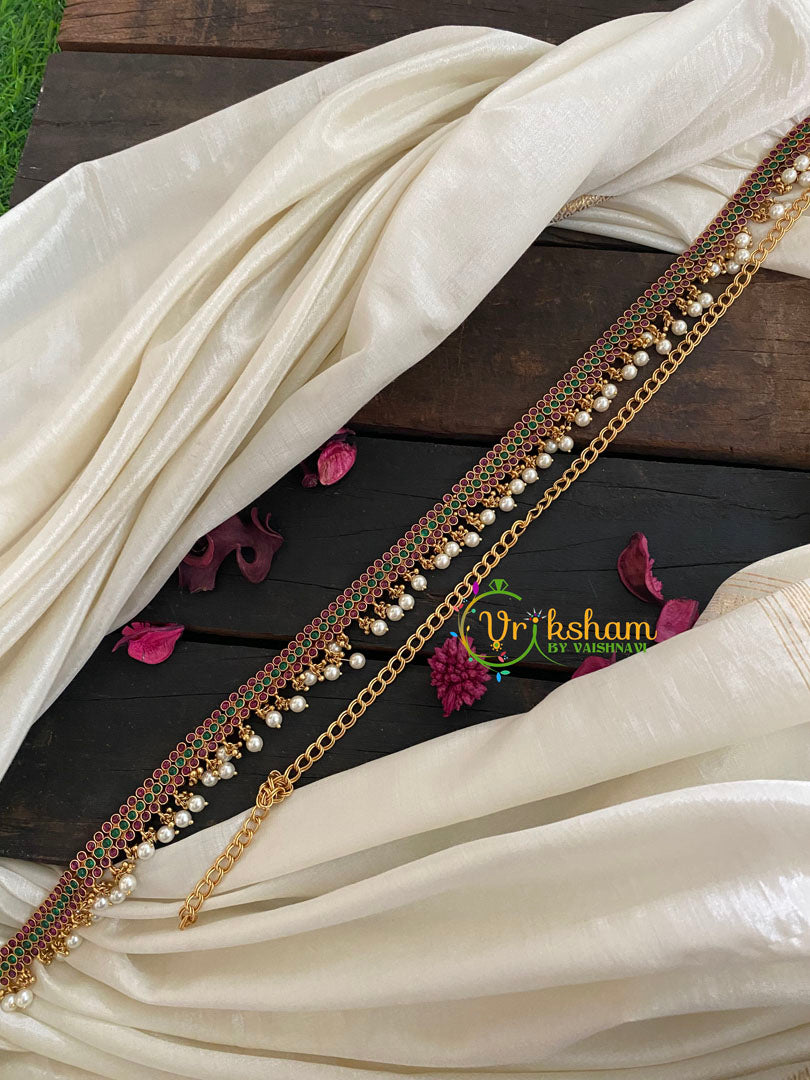 Red Green American Diamond Bridal Hip Chain –Gold tone hip chain with beautiful layers of red green stone and pearl finish and adjustable back chain.