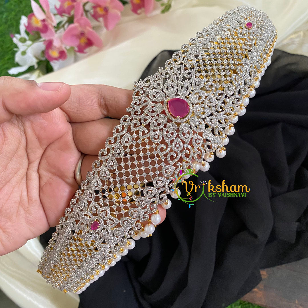Pemium American Diamond Bridal Hipbelt -Pink -Tilak Single Centre Stone complete white American diamond hipbelt with stone hanging finish. Made for wedding and festive occasions. Premium finish hip belt.