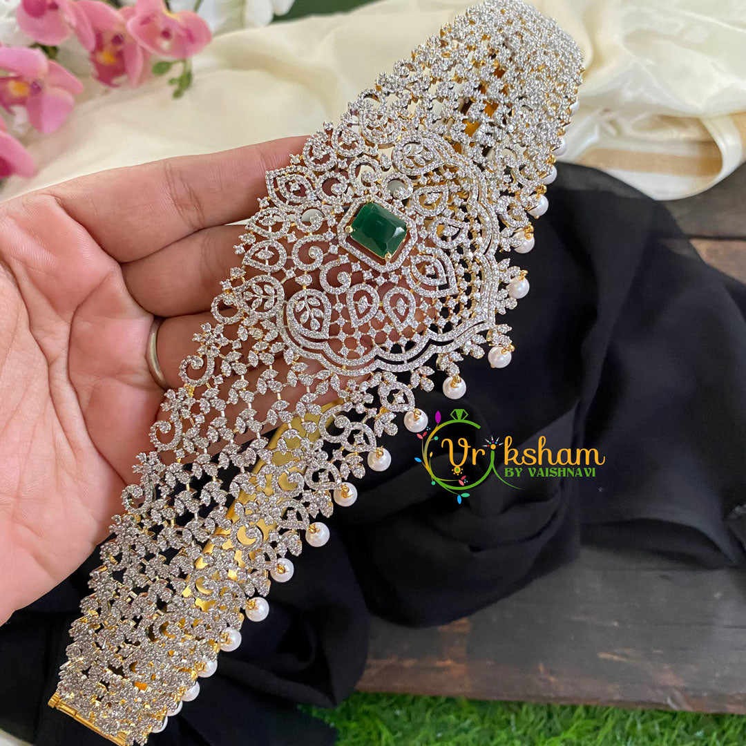 Pemium American Diamond Bridal Hipbelt -Green-Single Centre Stone complete white American diamond hipbelt with Pearl finish. Made for wedding and festive occasions. Premium finish hip belt.