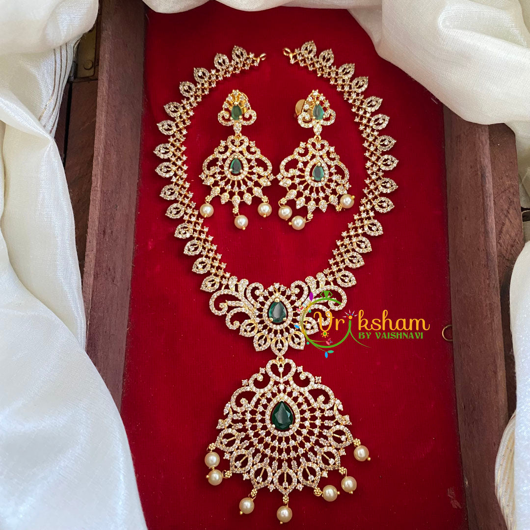 Gold American Diamond Bridal Neckpiece– gold look alike tone with centre Green stone idol work in gold imitation jewelry set; Comes with a pair of similar earrings.
