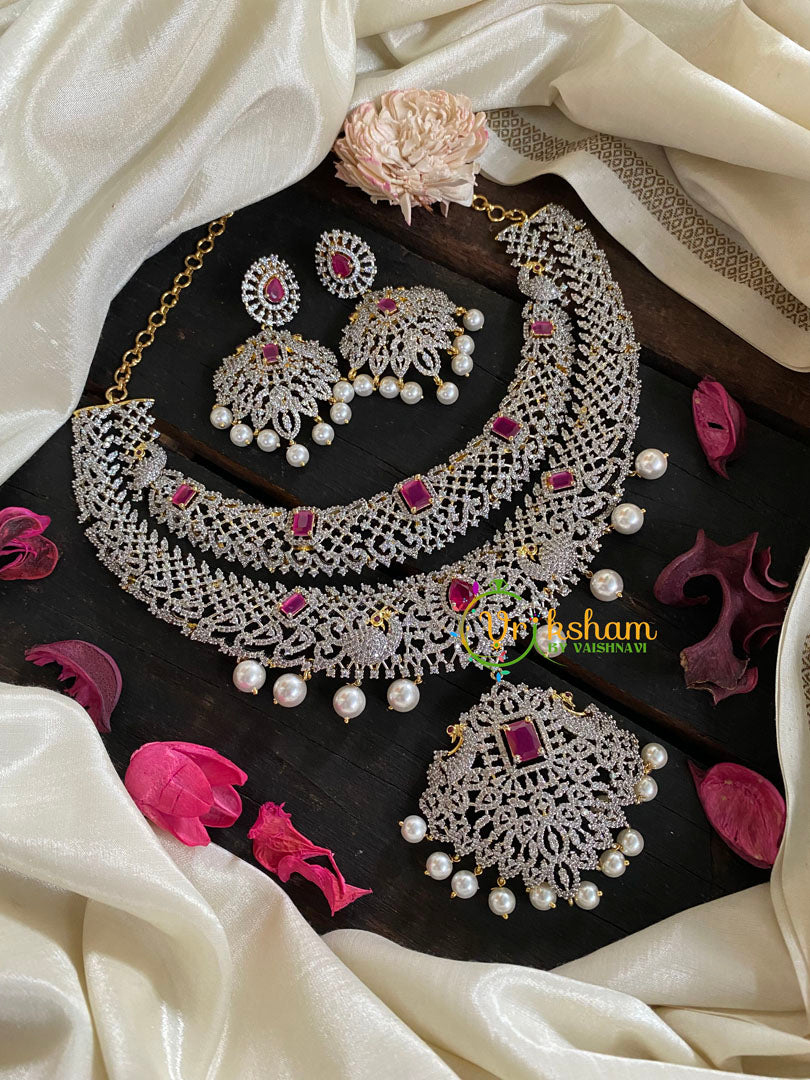 Red Stone American Diamond Bridal Neckpiece -2 broad layered and matching danglers. Peacock and red stone Pendant neckpiece. Gold tone polish short neckpiece.