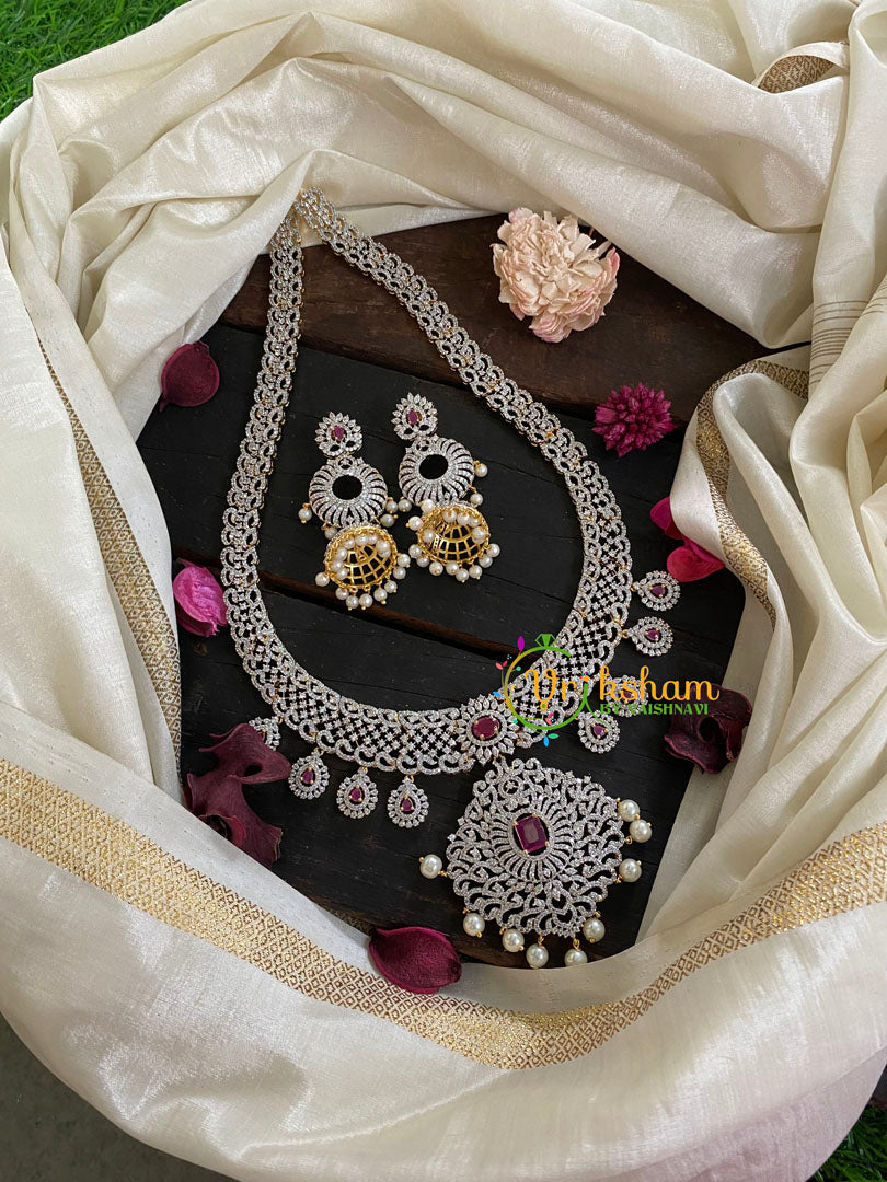 Royal American Diamond Bridal Red Haram-RED AND WHITE stone set with Pendant ends and side pendants. Comes with matching danglers.
