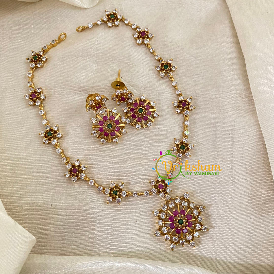 American Diamond Choker Short Neckpiece -Red Green and white AD stone flower in side a patterned choker short neckpiece with earrings.