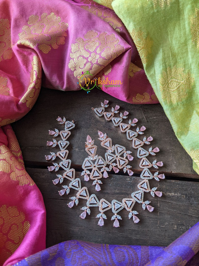 American Diamond Choker -Light Pink tear drops in white geometric patterned neckpiece. Comes with matching ear danglers.