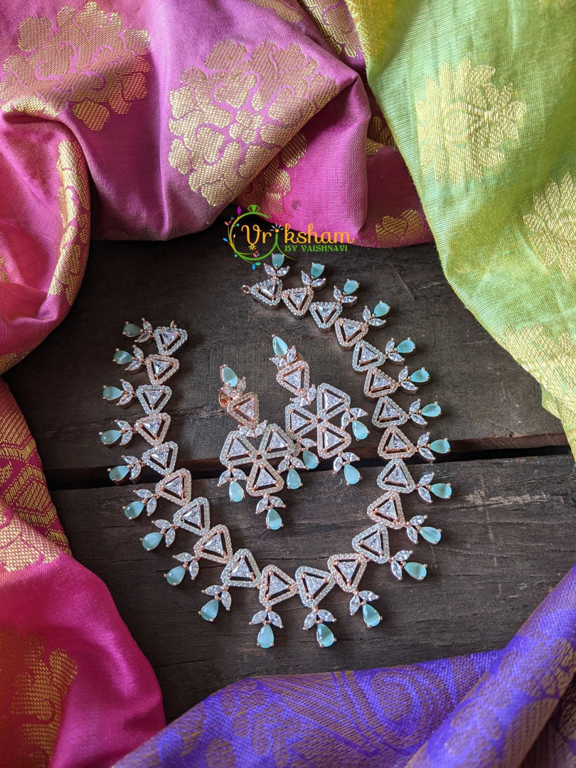 American Diamond Choker -Sky Blue tear drops in white geometric patterned neckpiece. Comes with matching ear danglers.