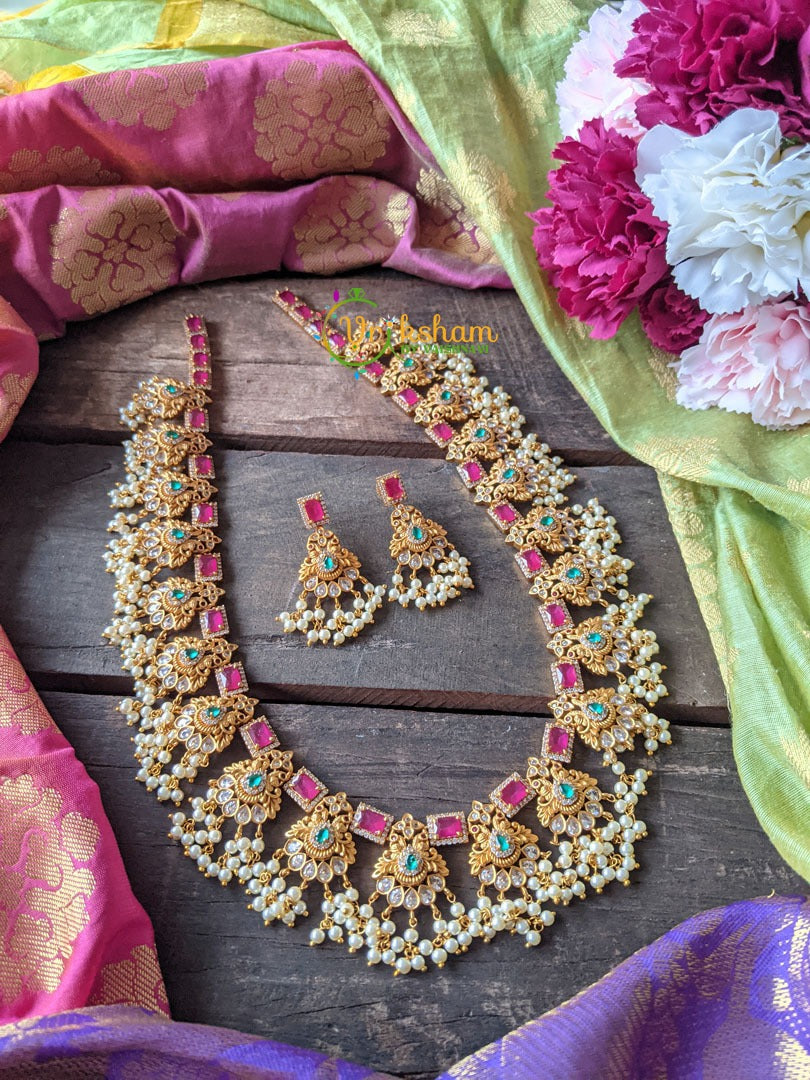 American Diamond Guttapusalu Haram -White, Green AD stone arranged Peacock pattern with alternate pink stone arrangement; bottom layer finishes with Guttapusalu pearls. Comes with pair of ear hangings.