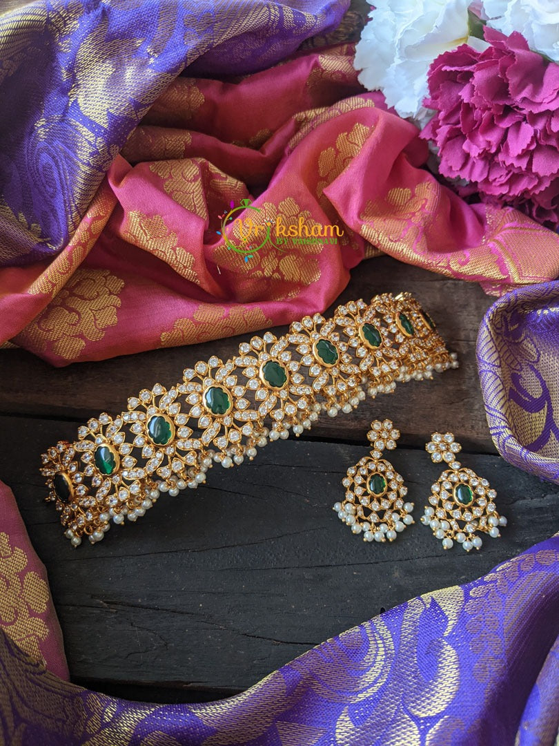 American Diamond High Neck Choker – Green comes with AD stone ear hangings.