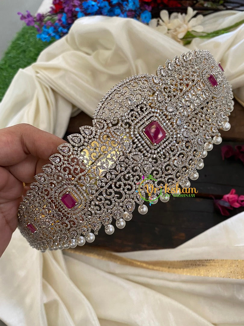 Pink Stone American Diamond Hip belt-Broader hip belt with square shaped pink stones on a complete white American diamond hip belt with pearl Finish.