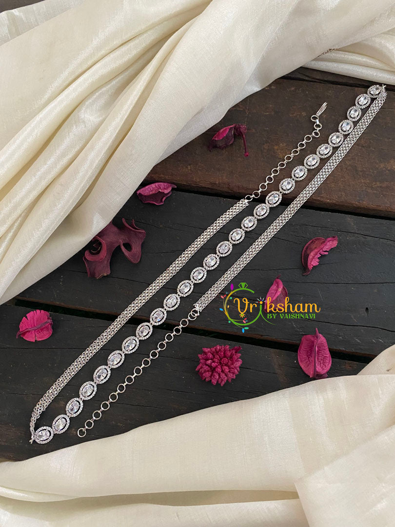 American Diamond Hip Chain- Bridal Hipbelt-Oval Links-White stone pattern –white tone hip chain with adjustable back chain.