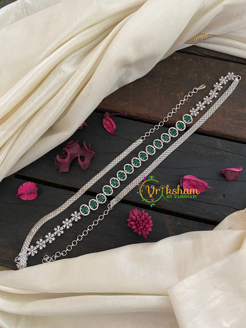 American Diamond Hip Chain- Bridal Hipbelt-Oval Links-Green Oval green and white Flower stone pattern –white tone hip chain with adjustable back chain.