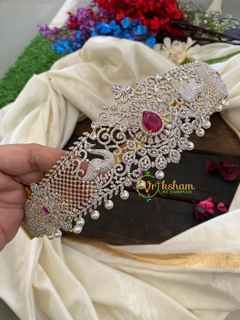 American Diamond Hipbelt -Centre Red Pink Tilak shaped stone complete white American diamond hipbelt with pearl and centre Jhumka Finish.